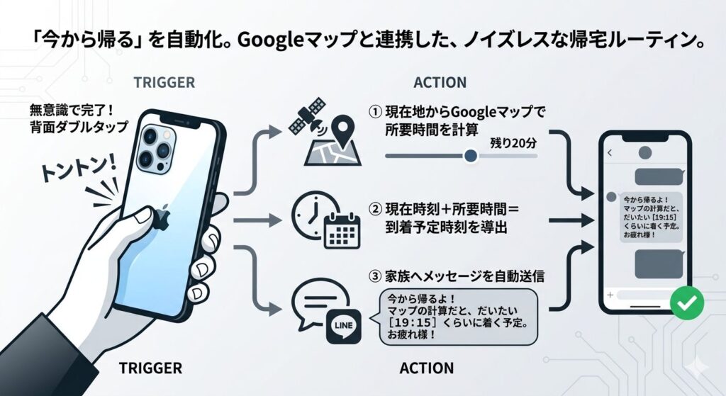 単なる定型文を送るだけでは不十分です。「何時に着くの?」という問いに答えるための「逆算」すら、機械に任せましょう。